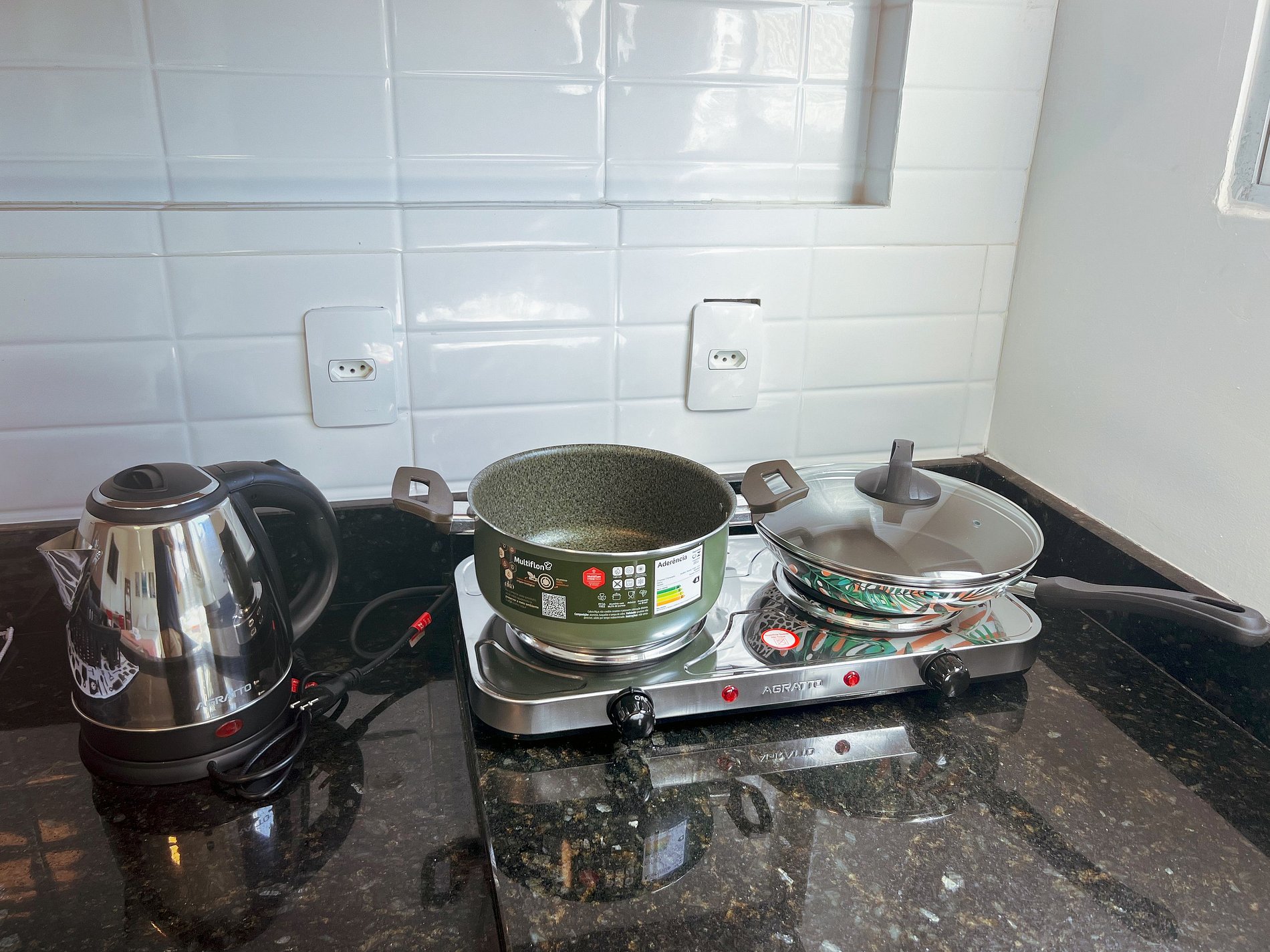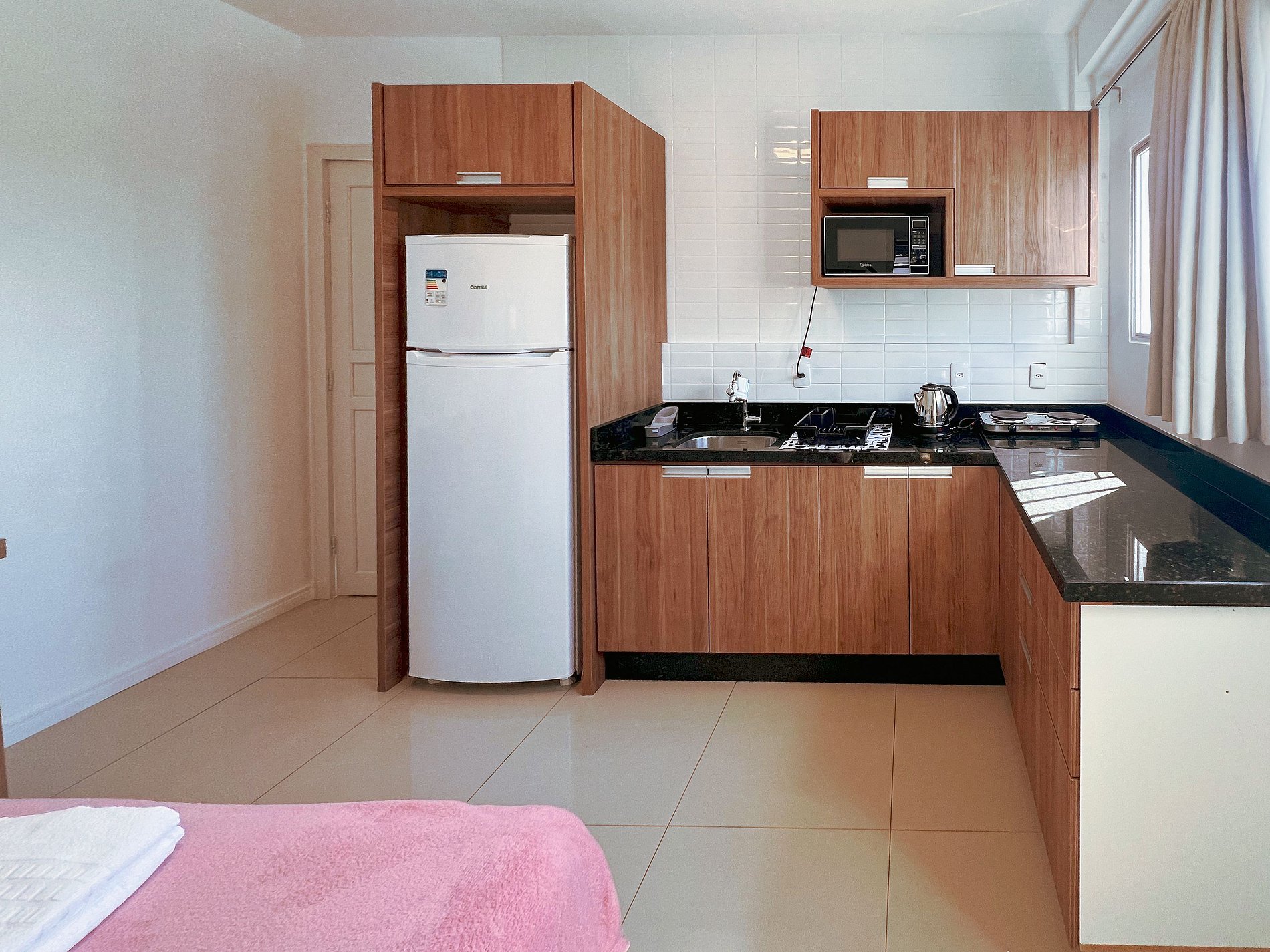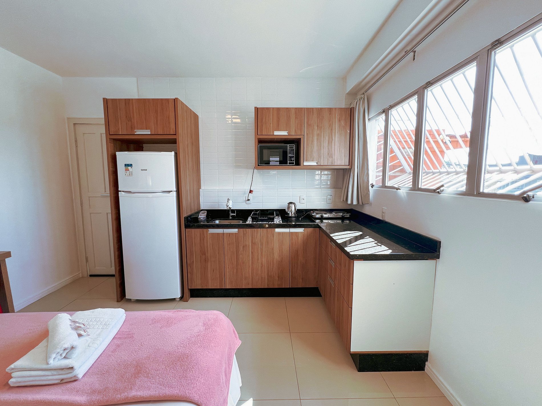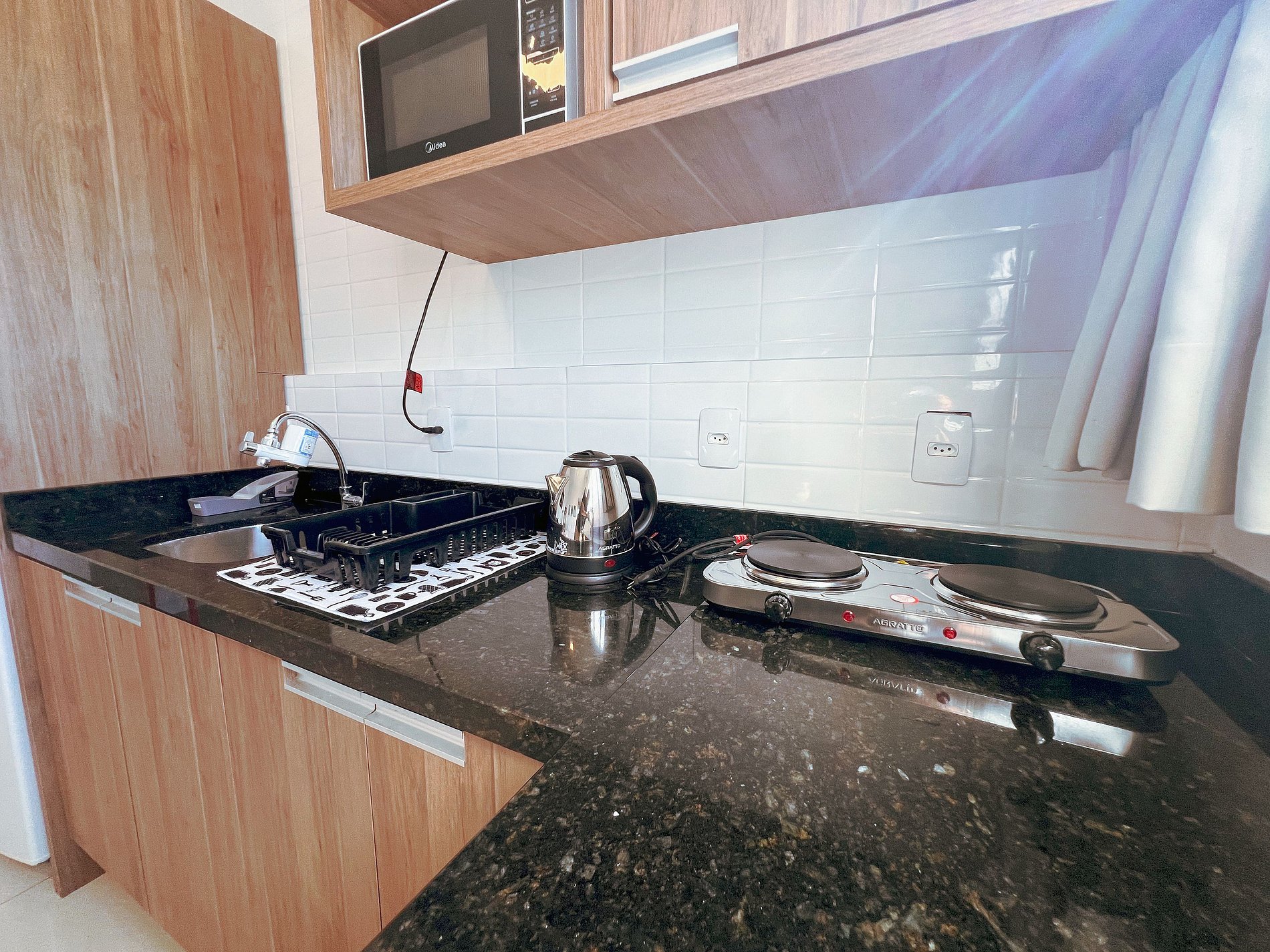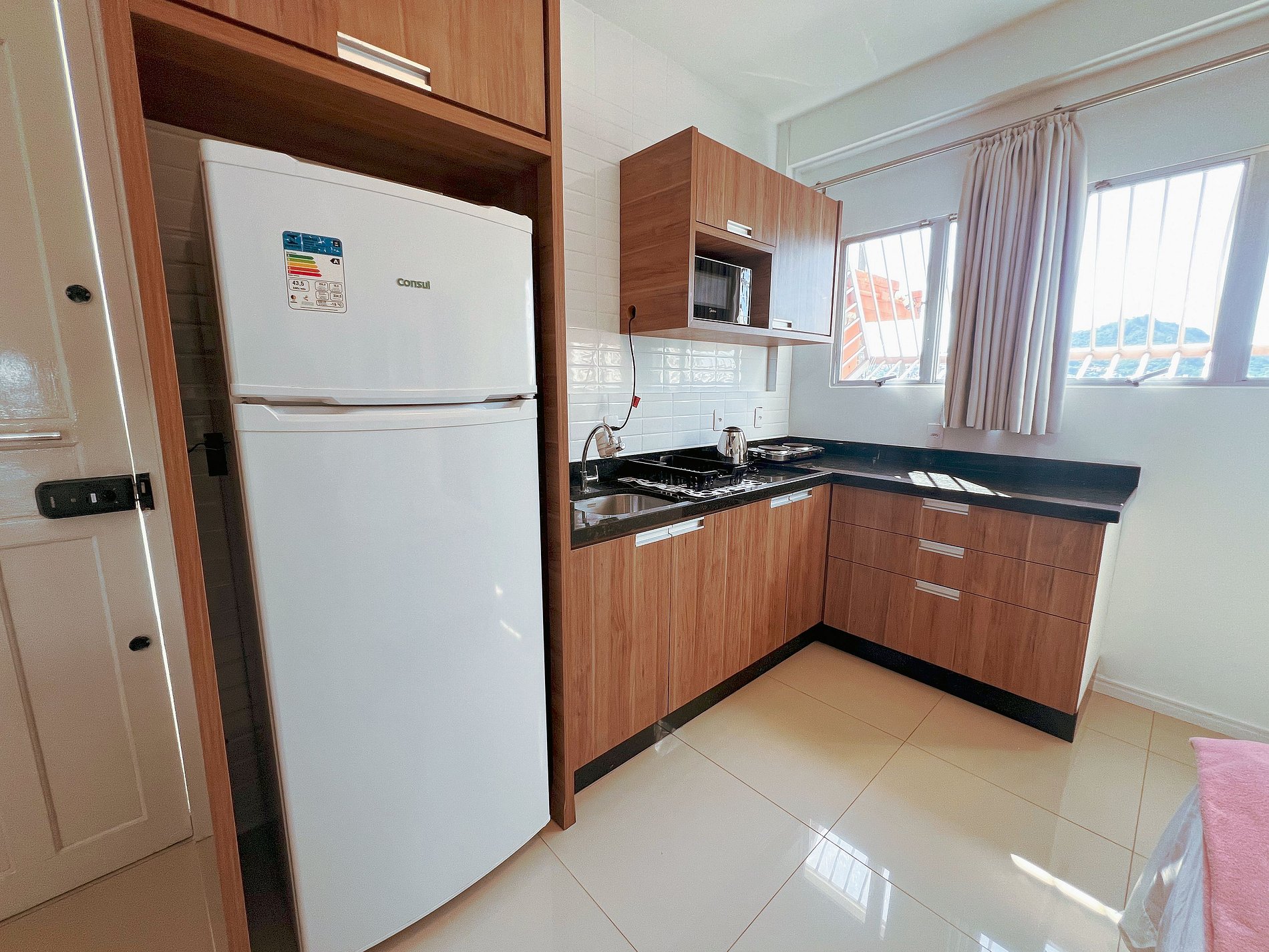 Cozinha completa – Equipada com cooktop, geladeira, micro-ondas e utensílios para preparar suas refeições.
