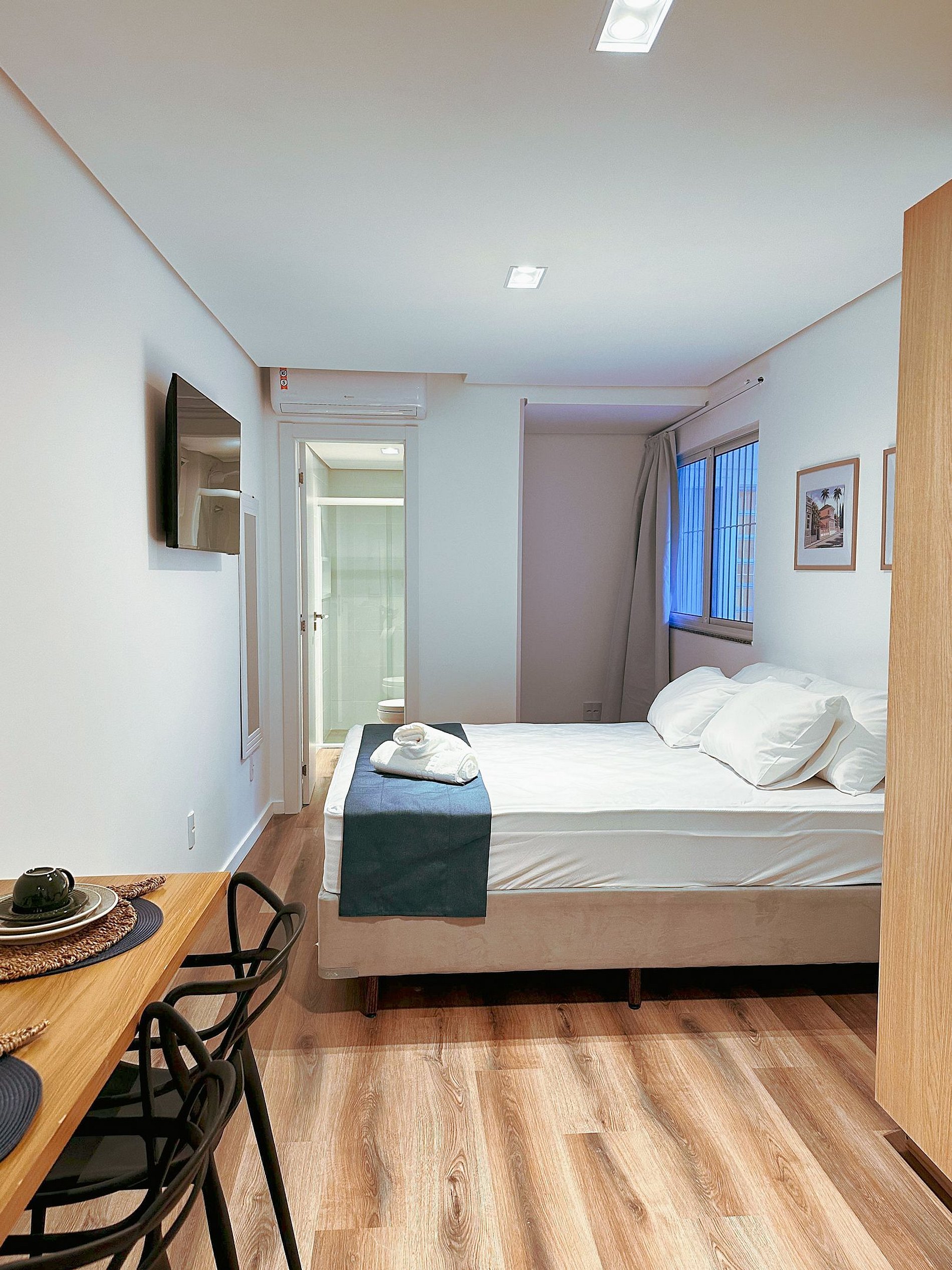 Os estúdios são ideais para estadias curtas ou médias, viagens a trabalho ou lazer, oferecendo um espaço funcional, bem distribuído e confortável para descansar após um dia na cidade.