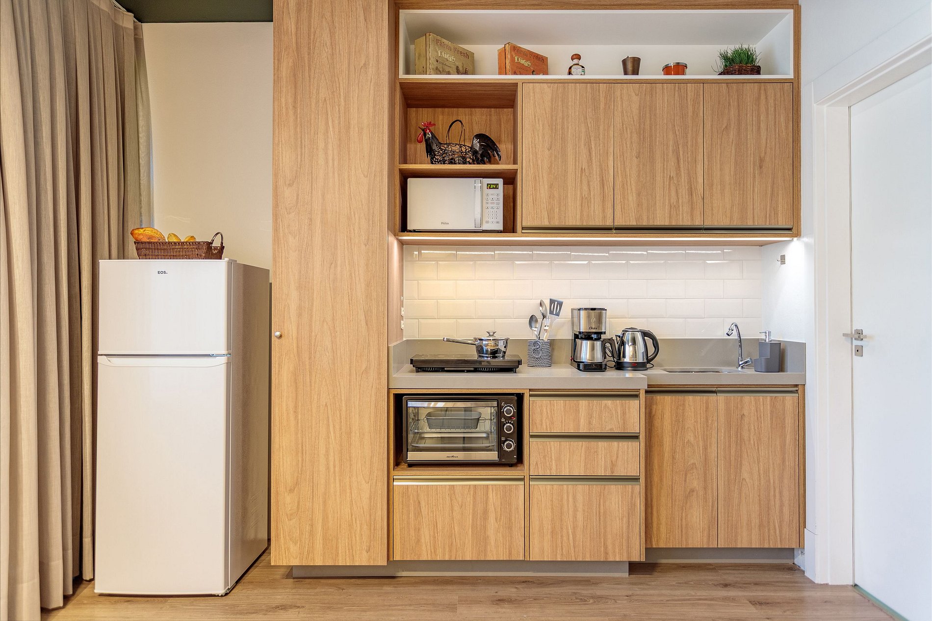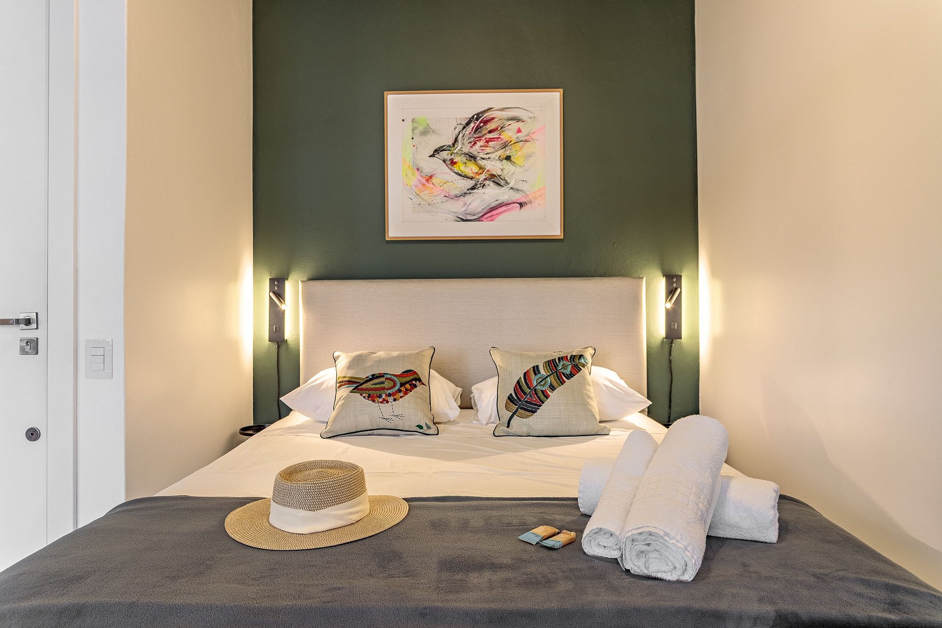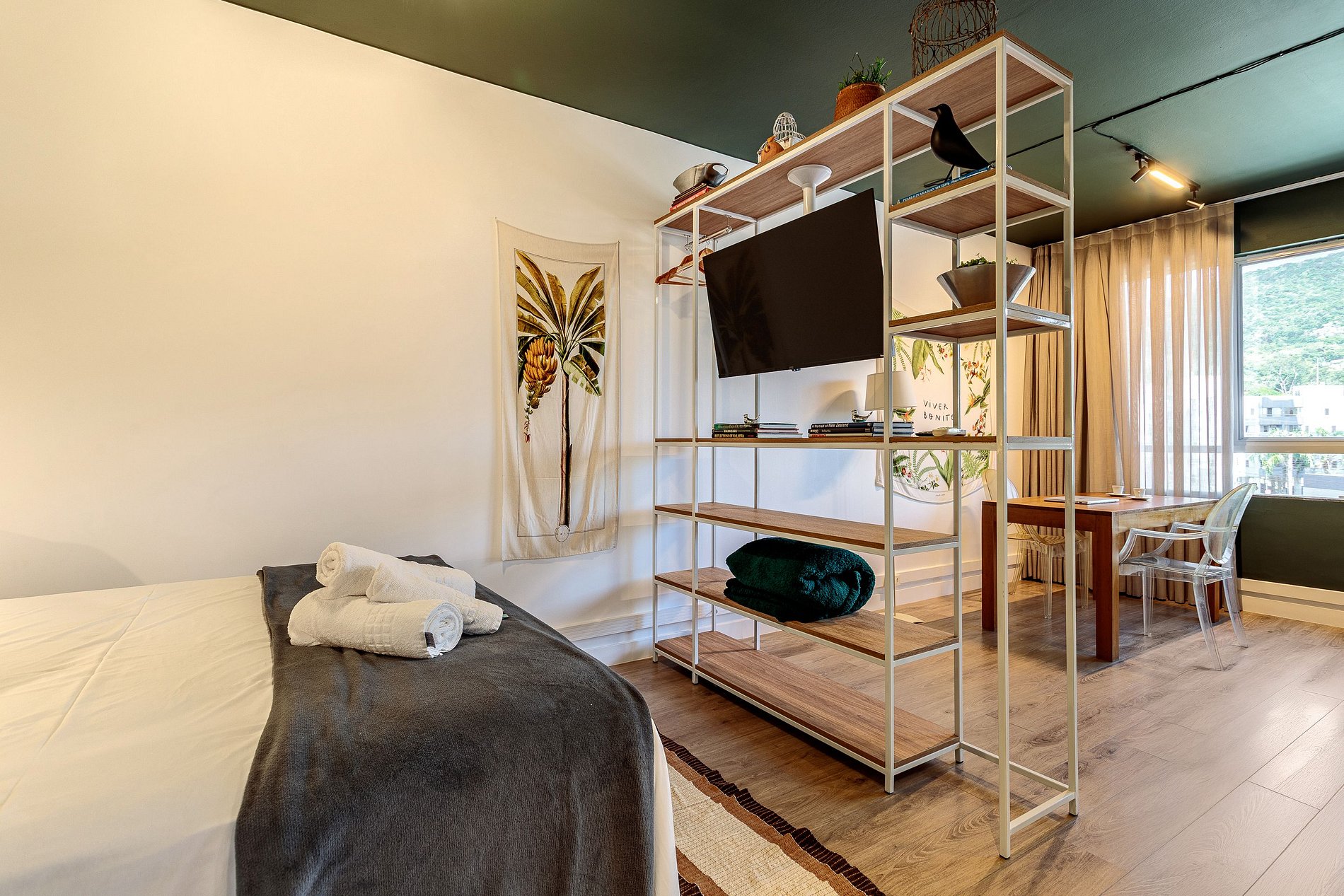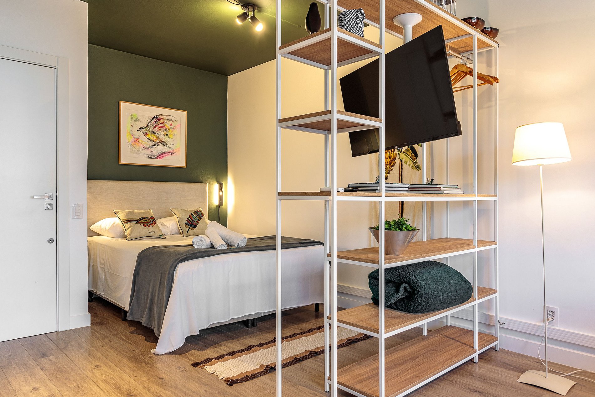 Studio de 30m² onde o verde e os elementos naturais se encontram em harmonia. A decoração é inspirada em pássaros e árvores tropicais, com paleta de cores acolhedoras, iluminação suave e detalhes em madeira. O ambiente transmite tranquilidade, frescor e contemporaneidade, perfeito tanto para quem busca momentos de descanso quanto para quem precisa de um espaço funcional para trabalho ou estudo.