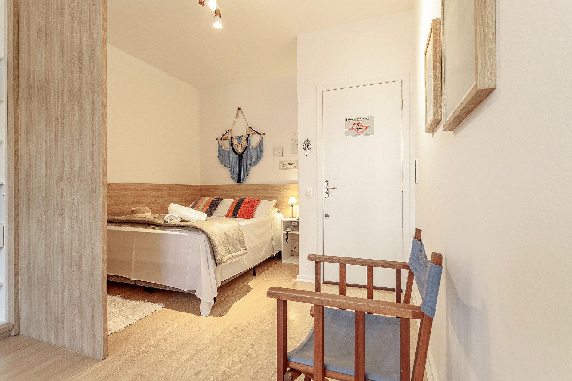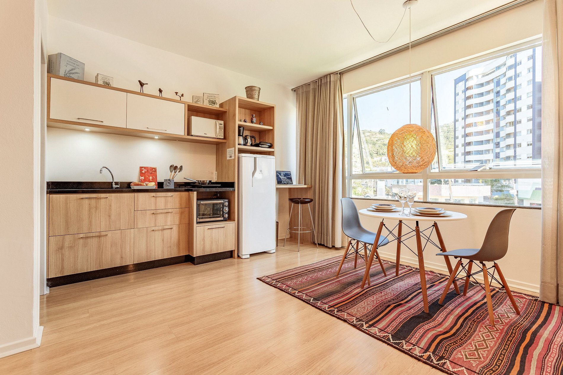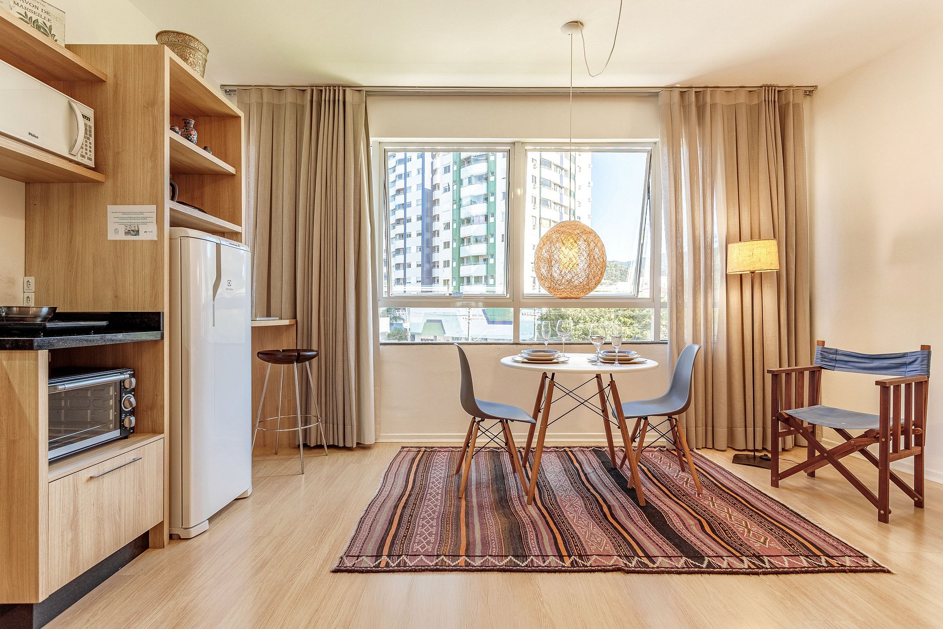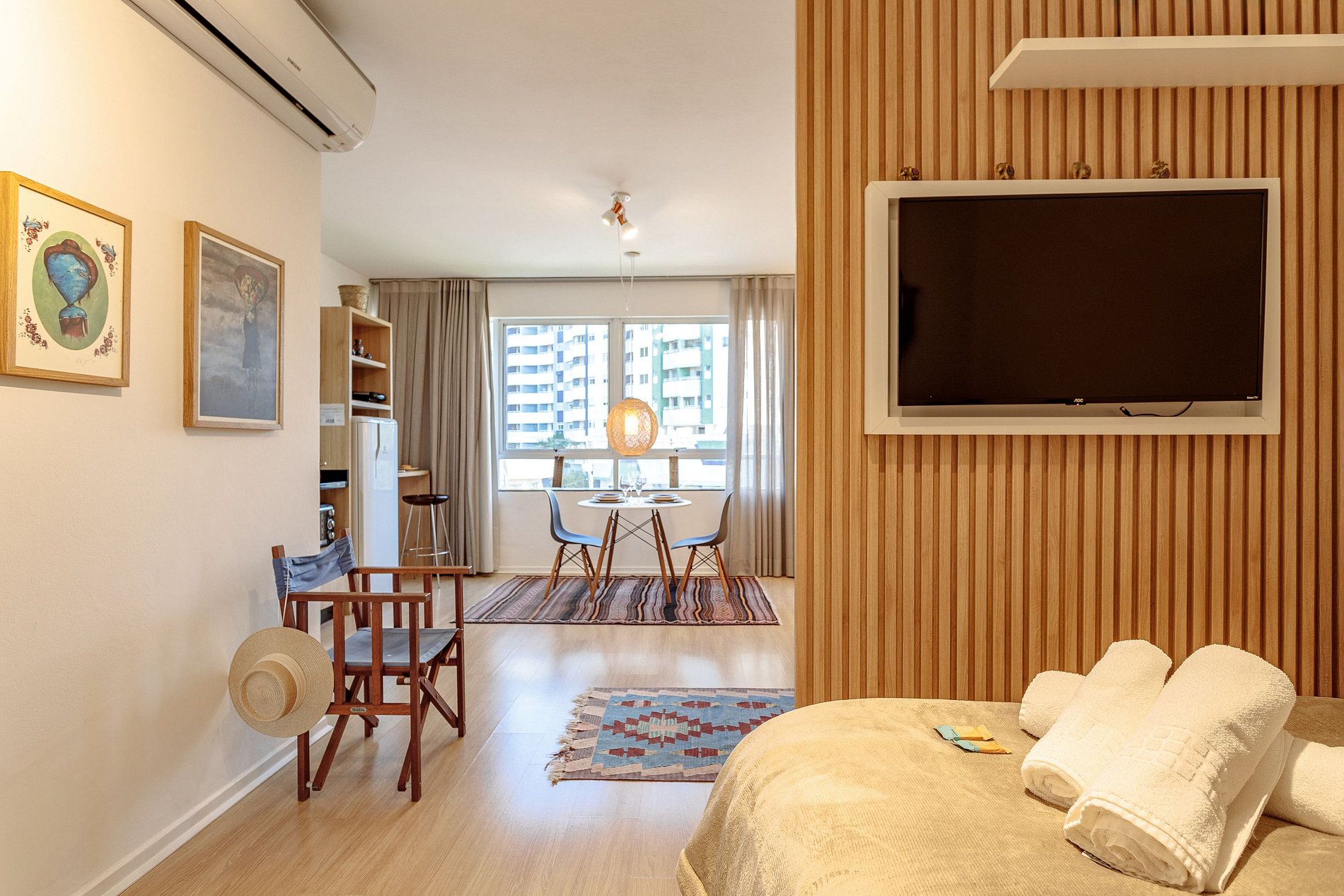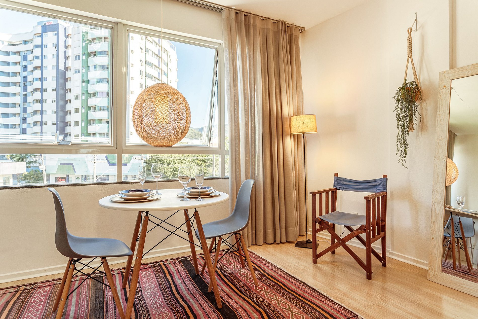 Studio novo de 30m² com decoração em estilo Folk, ideal para quem busca trabalhar ou estudar. Cozinha completa com eletrodomésticos novos (fogão de indução), TV Smart de 43”, duas redes de Wi-Fi de 200 mega (fibra óptica) e ar-condicionado de 18.000 BTUs. Local tranquilo, seguro e aconchegante, com garagem coberta. A menos de 100 metros de padaria, farmácia, mercado, barzinhos e sorveteria. Localizado entre o Centro e a Lagoa da Conceição, próximo à UFSC, UDESC e UniSociesc.