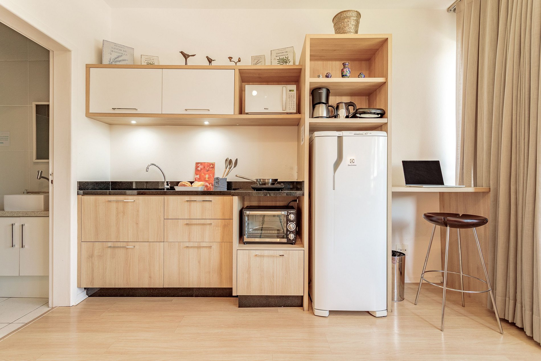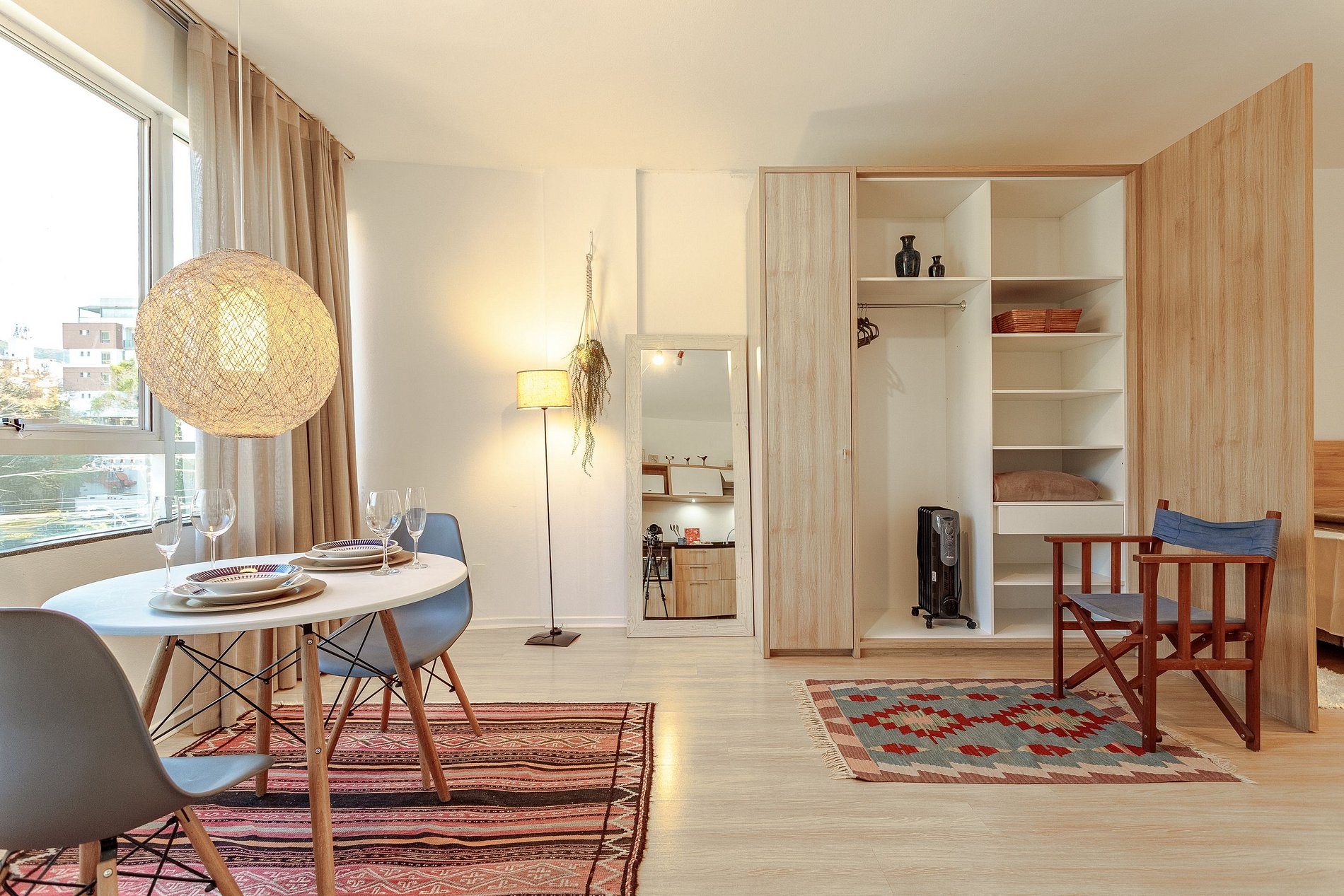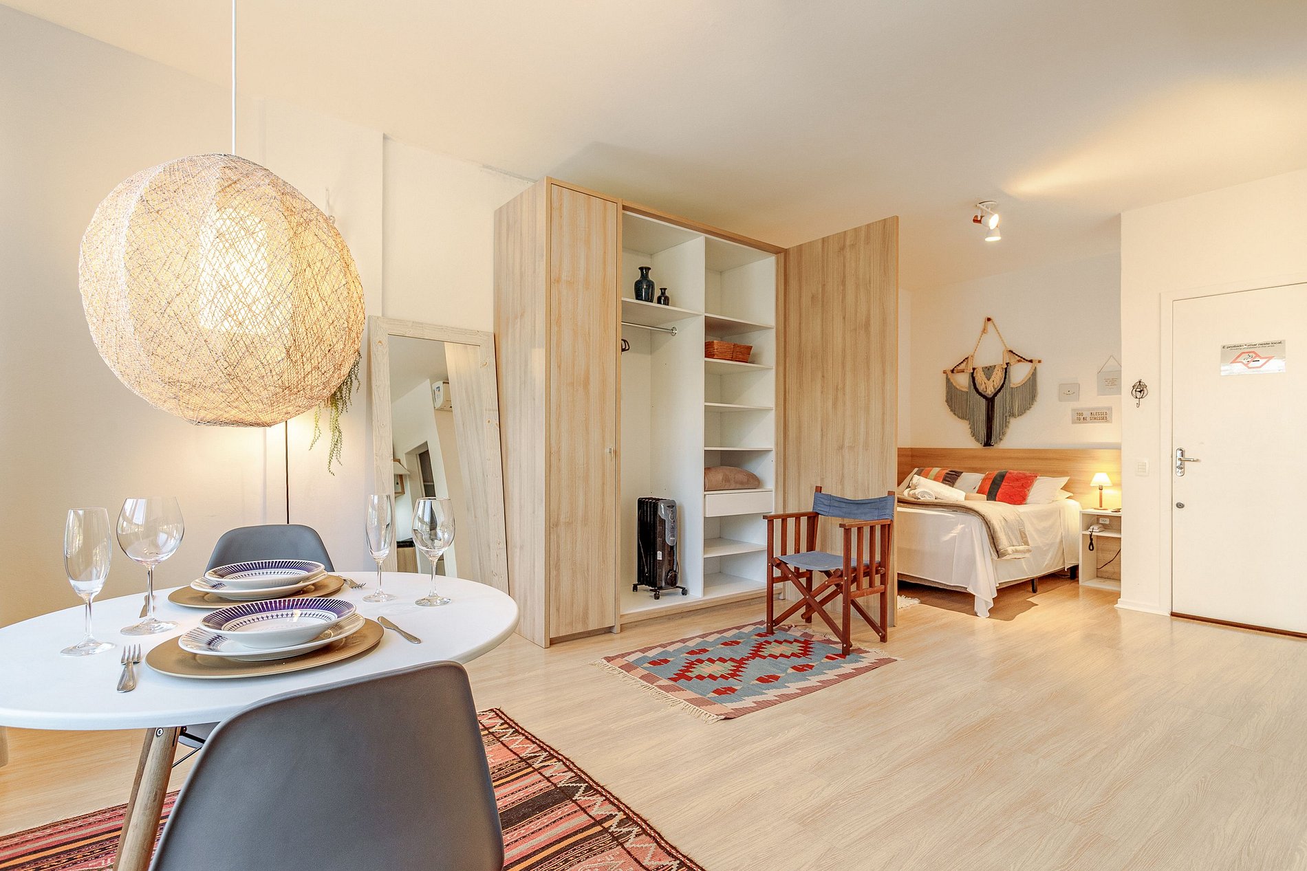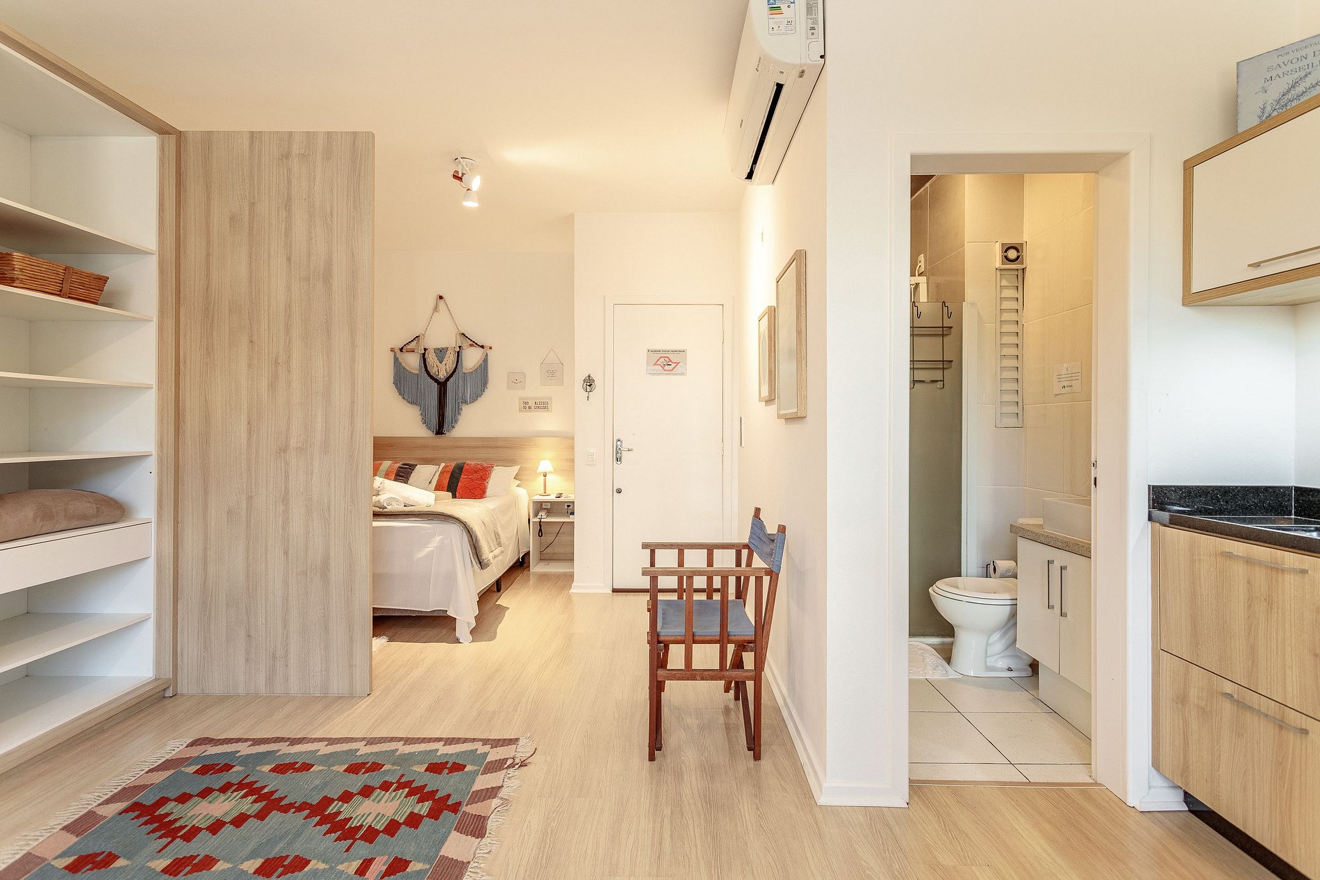 Este studio de 30m², com uma charmosa decoração em estilo Folk, foi projetado para oferecer conforto e praticidade a quem busca um ambiente aconchegante e bem equipado. A decoração acolhedora combina elementos rústicos e modernos, criando um espaço que convida ao relaxamento e ao foco, ideal para quem está trabalhando ou estudando.