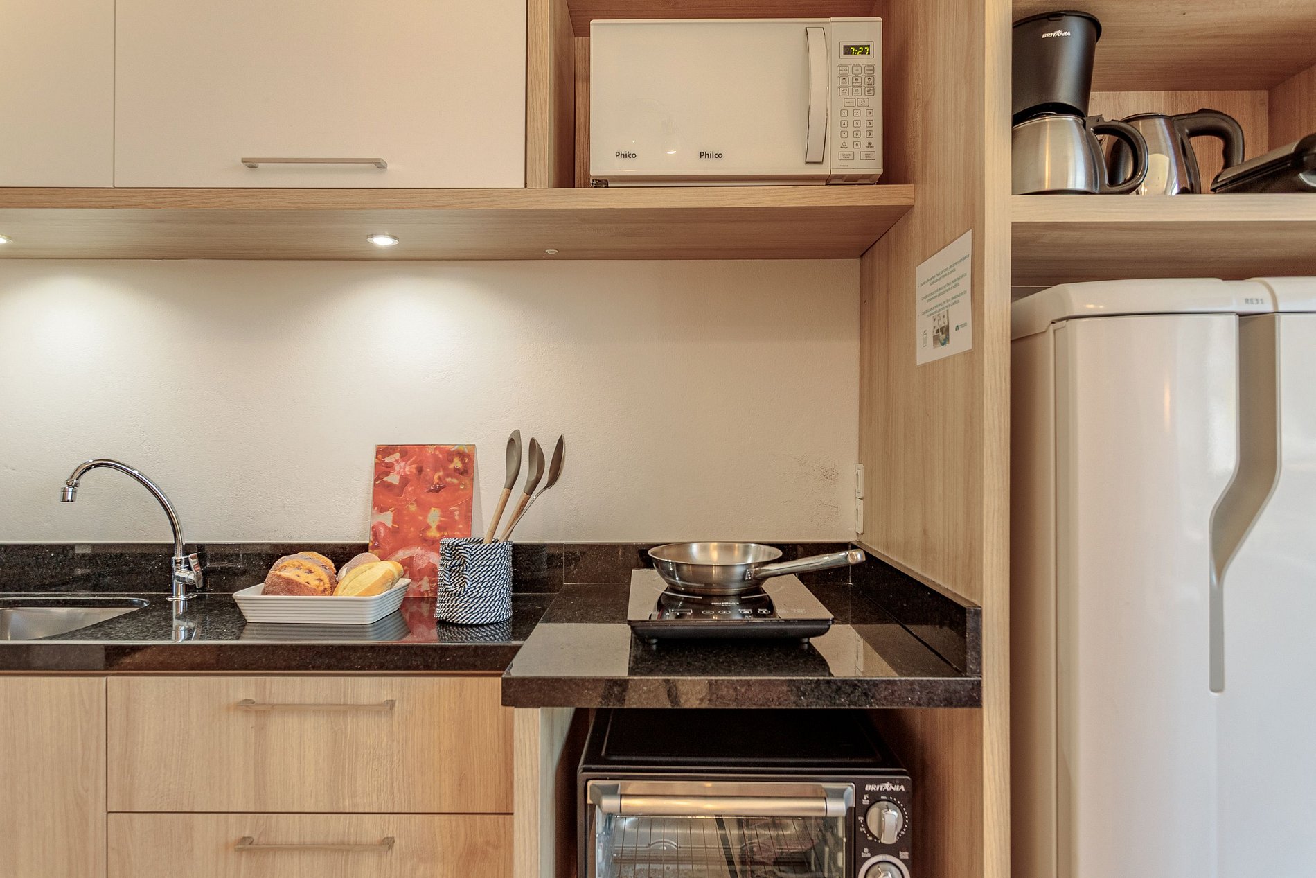 A cozinha completa, com eletrodomésticos novos e fogão de indução, oferece tudo o que você precisa para preparar suas refeições. O Wi-Fi de 200 mega, com duas redes independentes, garante uma conexão estável e rápida, perfeita para trabalho remoto ou streaming sem interrupções. A TV Smart de 43” e o ar-condicionado de 18.000 BTUs completam o ambiente, proporcionando conforto em qualquer clima.