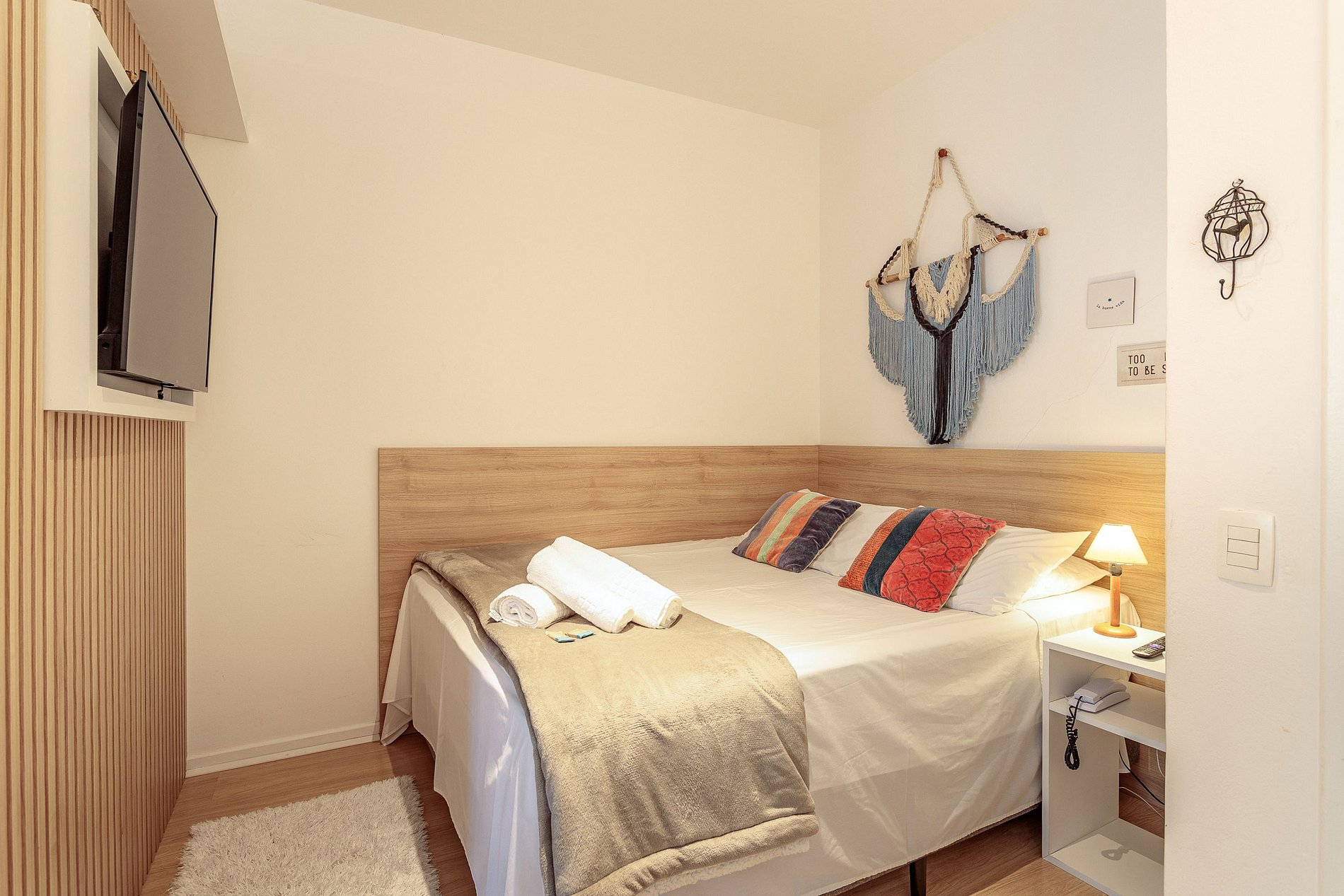 Este studio de 30m², com uma charmosa decoração em estilo Folk, foi projetado para oferecer conforto e praticidade a quem busca um ambiente aconchegante e bem equipado. A decoração acolhedora combina elementos rústicos e modernos, criando um espaço que convida ao relaxamento e ao foco, ideal para quem está trabalhando ou estudando.